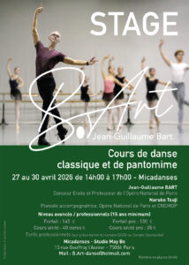 Niveau avancé et professionnel requis. âge minimum : 15 ans. Accompagnement au piano par Naruko Tsuji, pianiste du Ballet de l’Opéra de Paris et du CNSMDP