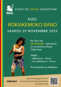 billetterie en ligne : https://www.helloasso.com/associations/kherie/evenements/stage-de-danse-avec-rokiakemoko-sano-29-novembre-2025