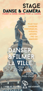 Ouvert aussi bien aux danseurs intéressés d’investir le langage des images, qu’aux praticiens de l’image ayant envie de travailler avec le corps, ce stage met tout le monde tour à tour devant et derrière la caméra. Peu importe votre niveau initial en vidéo ou en performance, vous serez guidé tout le long du week-end pour trouver votre propre vocabulaire corporel et visuel.