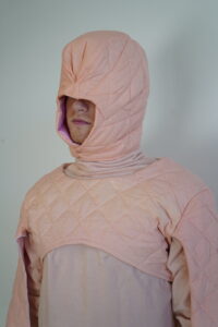 L’artiste se cache dans une grande forme noire qui brouille son apparence humaine, se transforme en une silhouette aux formes étranges coincée dans un catwalk et transporte un gros œuf intrigant.